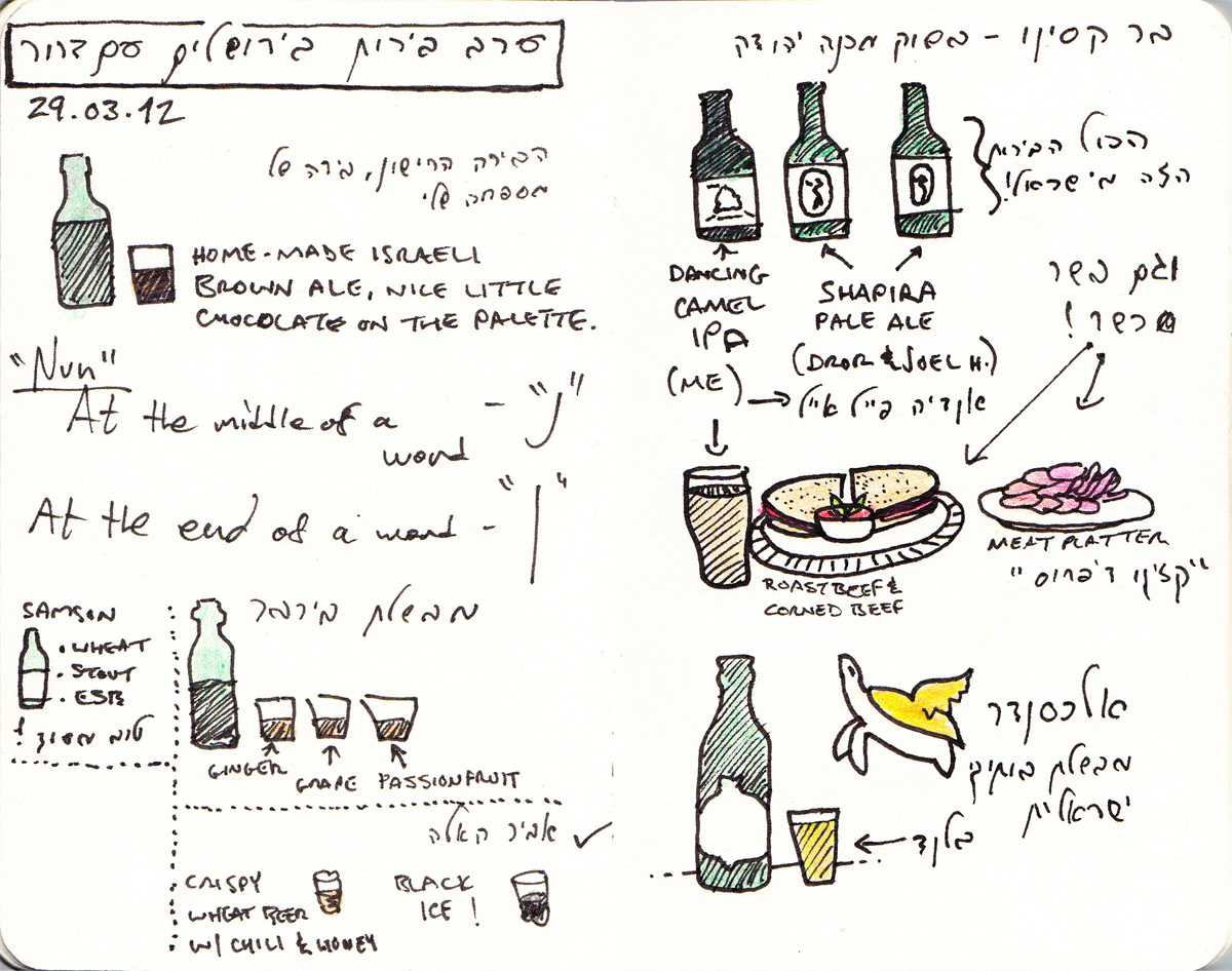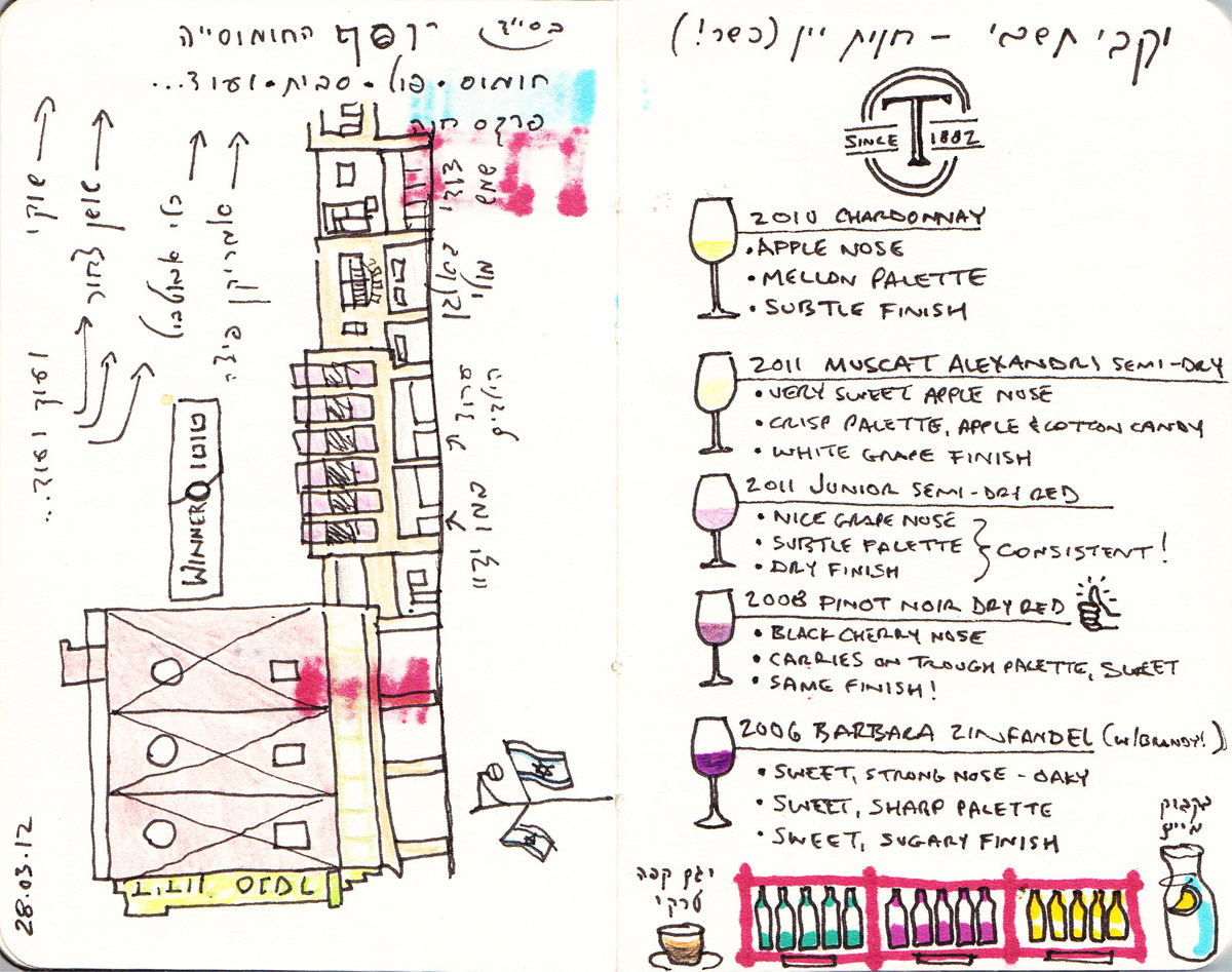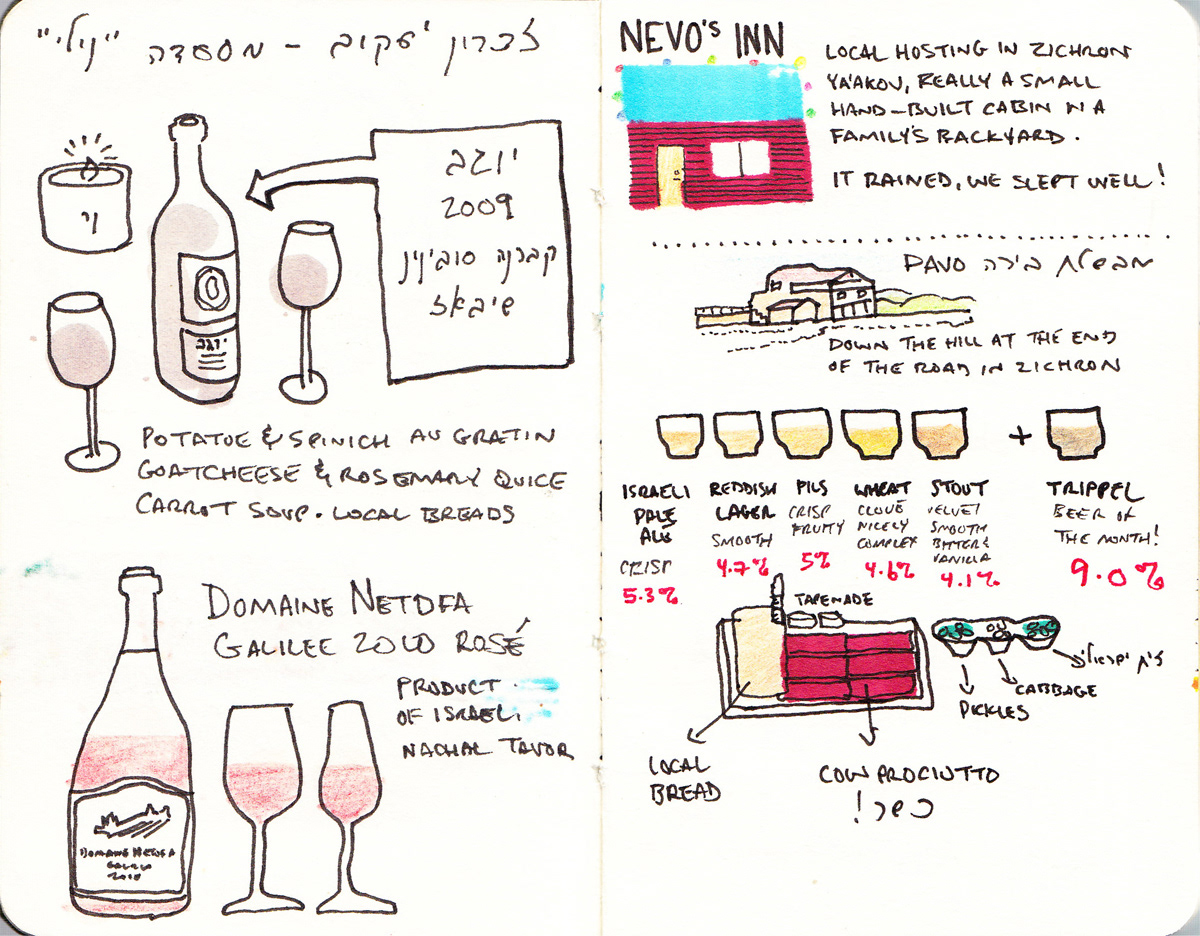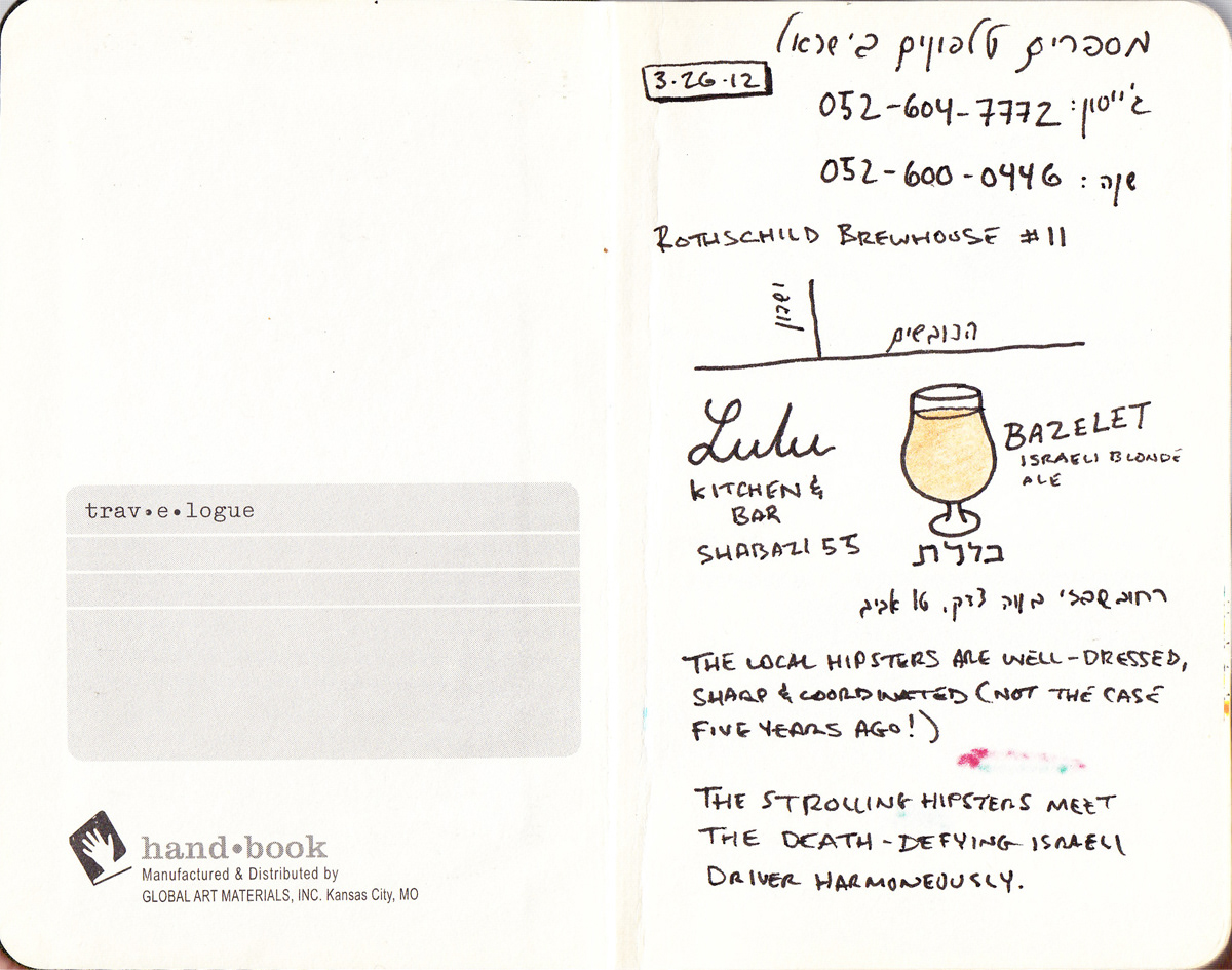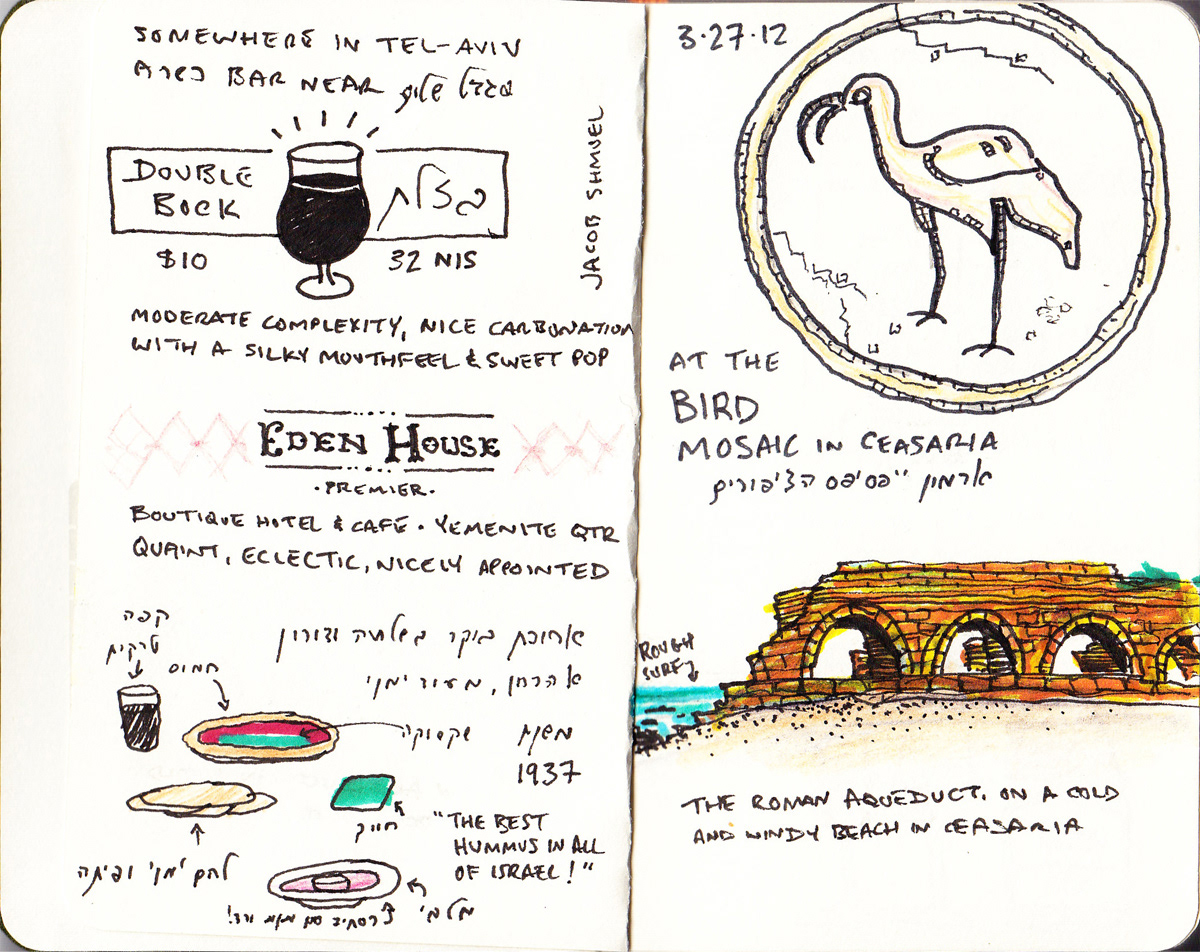 I've always been a fan of travel sketching, and on a 2012 trip to Israel, I decided to capture my favorite place in the world through a sketchbook. Using a 3" x 5" travel journal, a 4" x 6" sketchbook, and an array of markers, pens, and colored pencils, I focused primarily on Israel's wonderful foods, world-class wines, and their phenomenal craft beer scene.