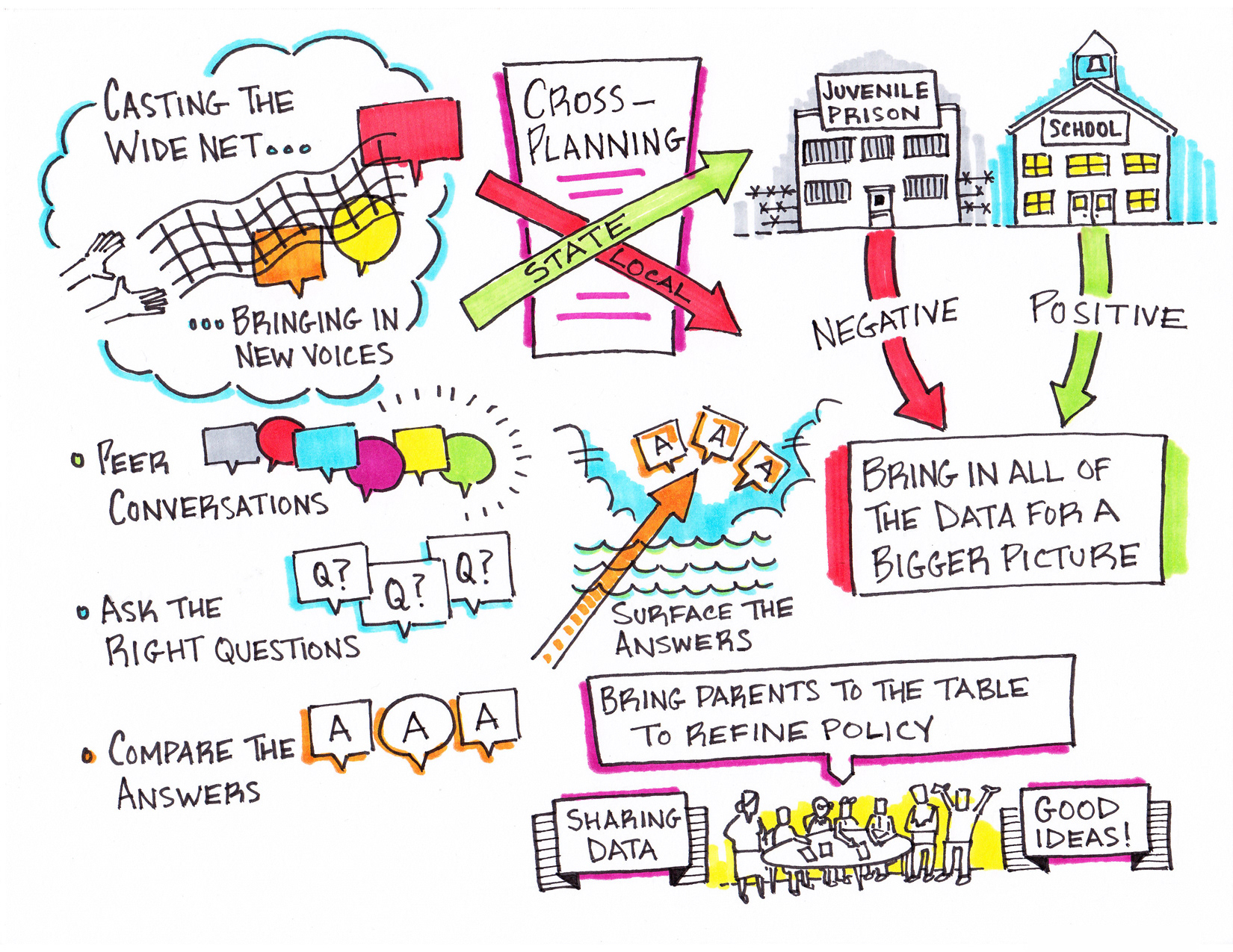 Webinar sketchnotes highlighting Minneapolis' Early Learning Initiative. These three pages represent 15 minutes of conversation, including an introductory presentation and an open-panel discussion. The real-time sketchnotes were subsequently traced and reworked into polished meeting notes, while keeping the spontaneous look and content of the original notes. The final sketchnotes (shown here) were subsequently distributed to the webinar participants.