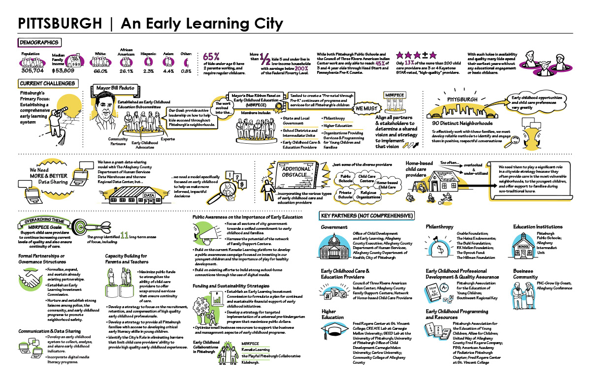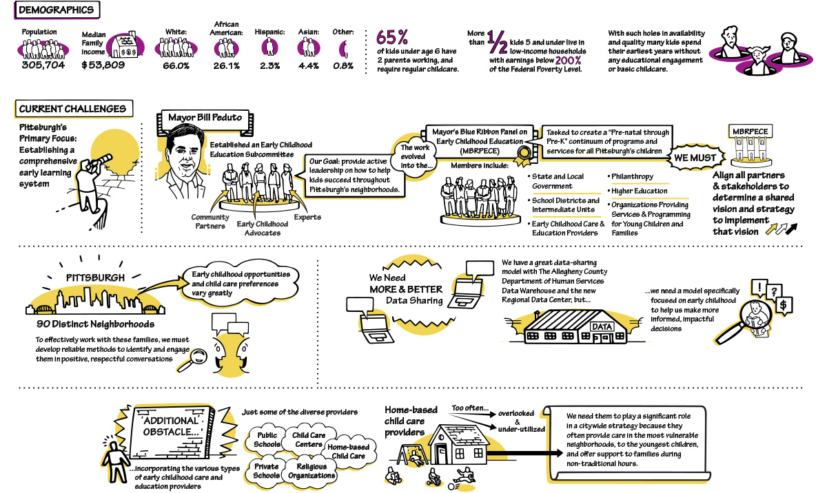 Infographic for Pittsburgh, Pennsylvania's Early Learning Nation initiative through the National League of Cities. Digitally rendered, with the icons being originally drawn and inked by hand, then scanned into the overall layout, complimented with a handwriting-style font.