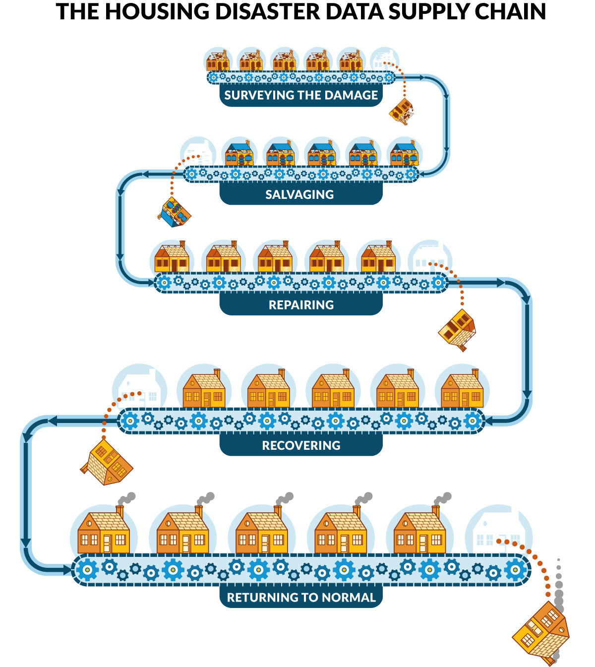 The five posts shown in conveyer belt fashion for use in the blog posts. Each post is made up of multiple stages, and involvingĀ various players and scenarios. The last scenario allows for pitfalls, where a homeowner could potentially fall through the cracks in the process, hence the house falling off the conveyer belt.