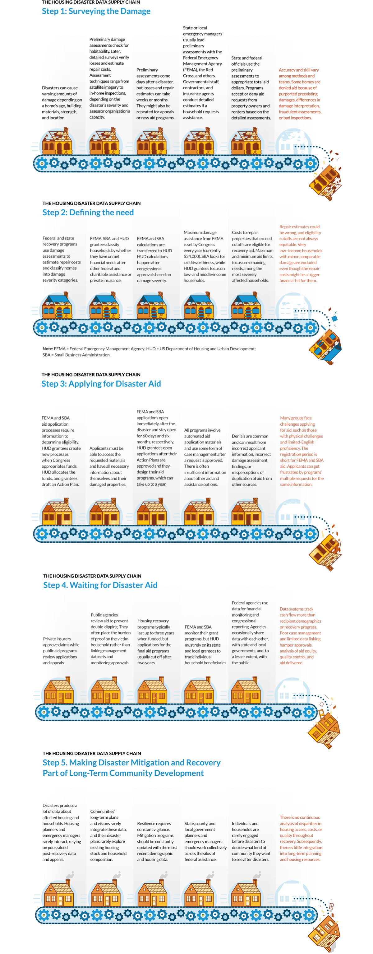 Icons and infographics for the Urban Institute's Housing Disaster Data Supply Chain initiative, used in blog posts by Urban Institute's Senior Fellow Carlos Martin.