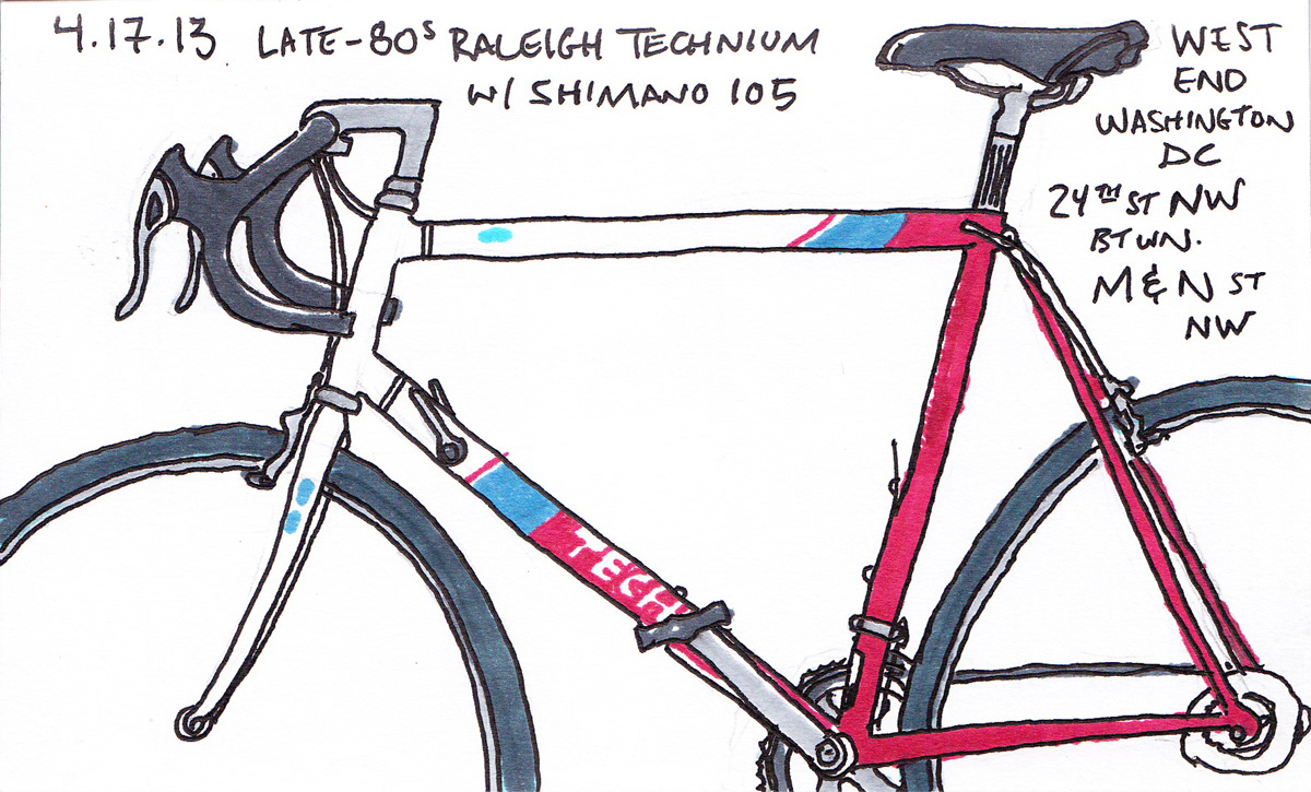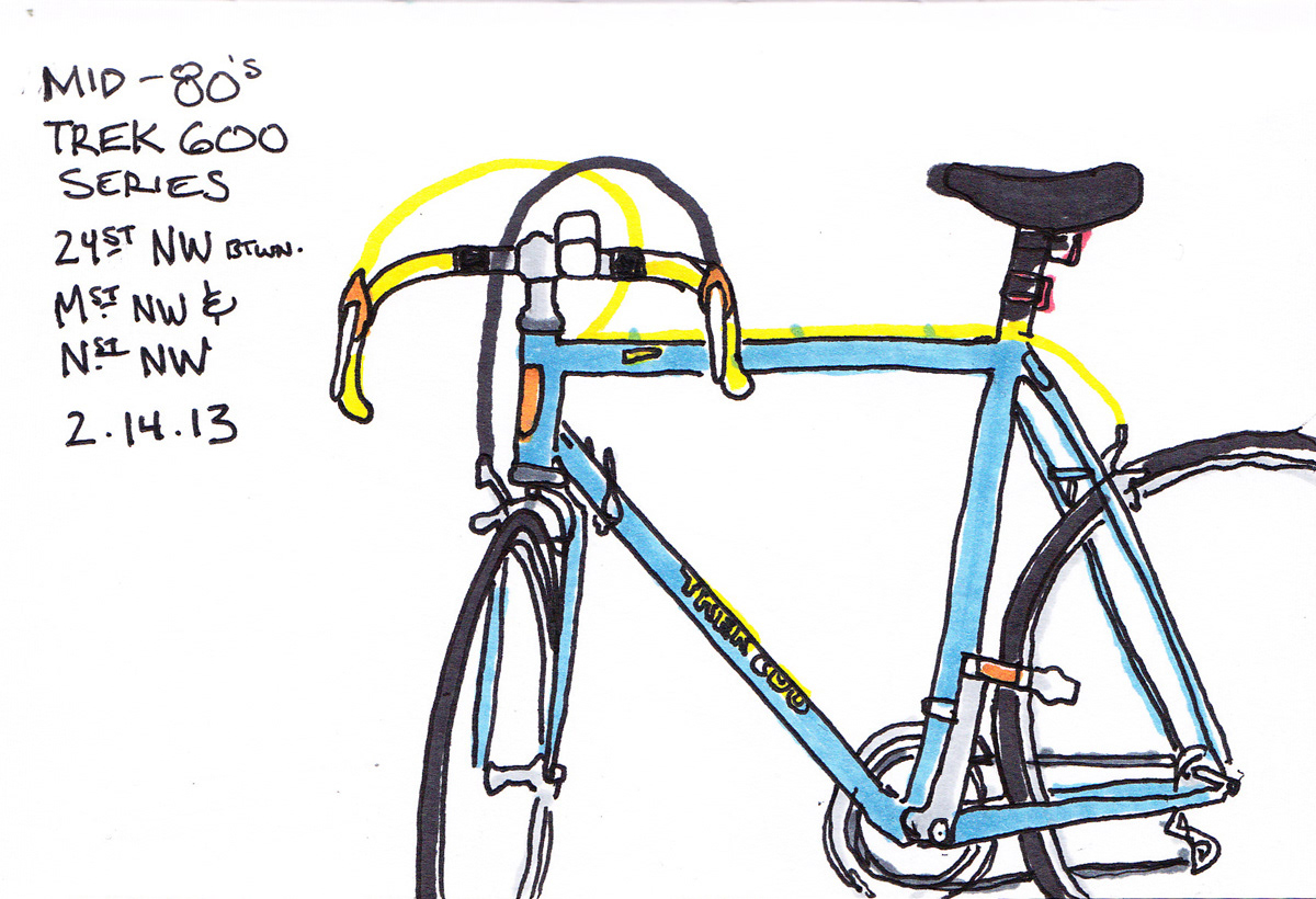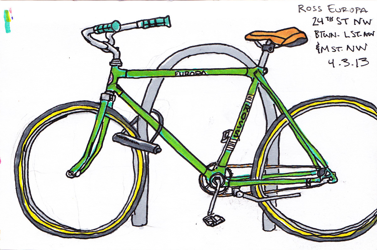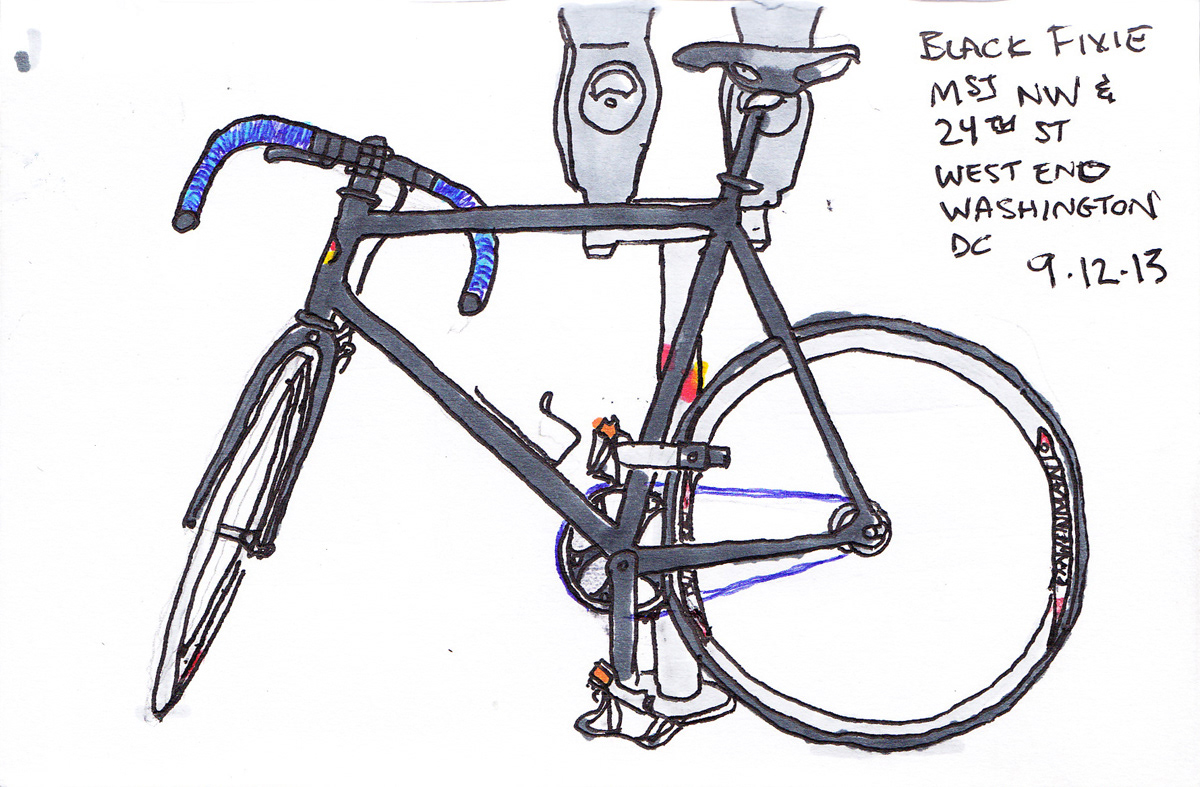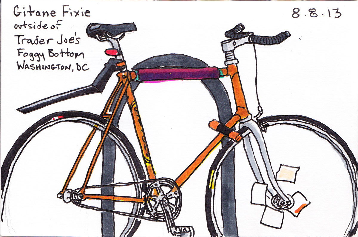 As a hardcore cyclist, I love all things cycling, particularly the very machine itself. During lunch breaks, I like to go outside and sketch some of the bicycles I see locked-up all over the sidewalks of Washington, DC. Done in roughly 1/2 hour, I start with some quick pencil lines to get the wheels and frame in proportion, and to map out details like saddles, crank arms, and the handlebar/stem. From there, I ink the drawing, and then add the colors with markers. All of these were done in a 4" x 6" sketchbook.